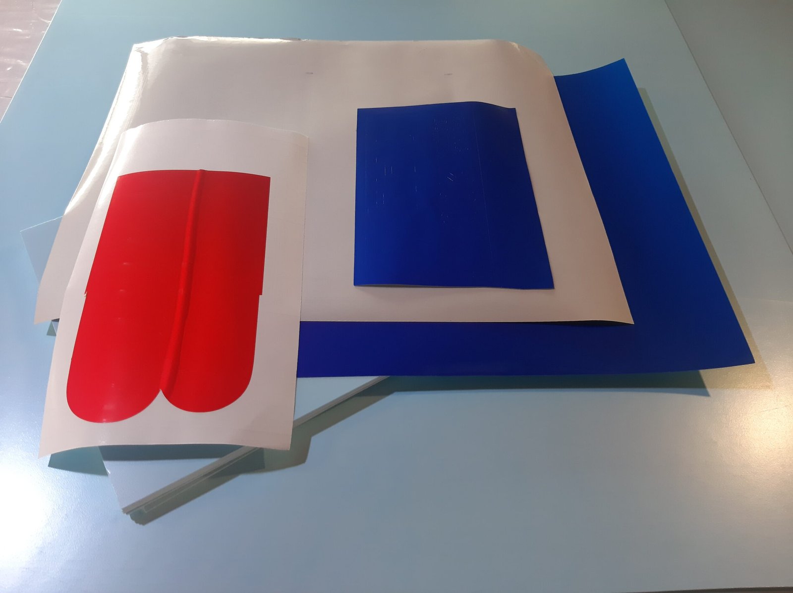 В векторних програмах намалювали макет таблички. По кольорам розбили на групи. Вирізали з кольорових плівок елементи для майбутнього виробу.